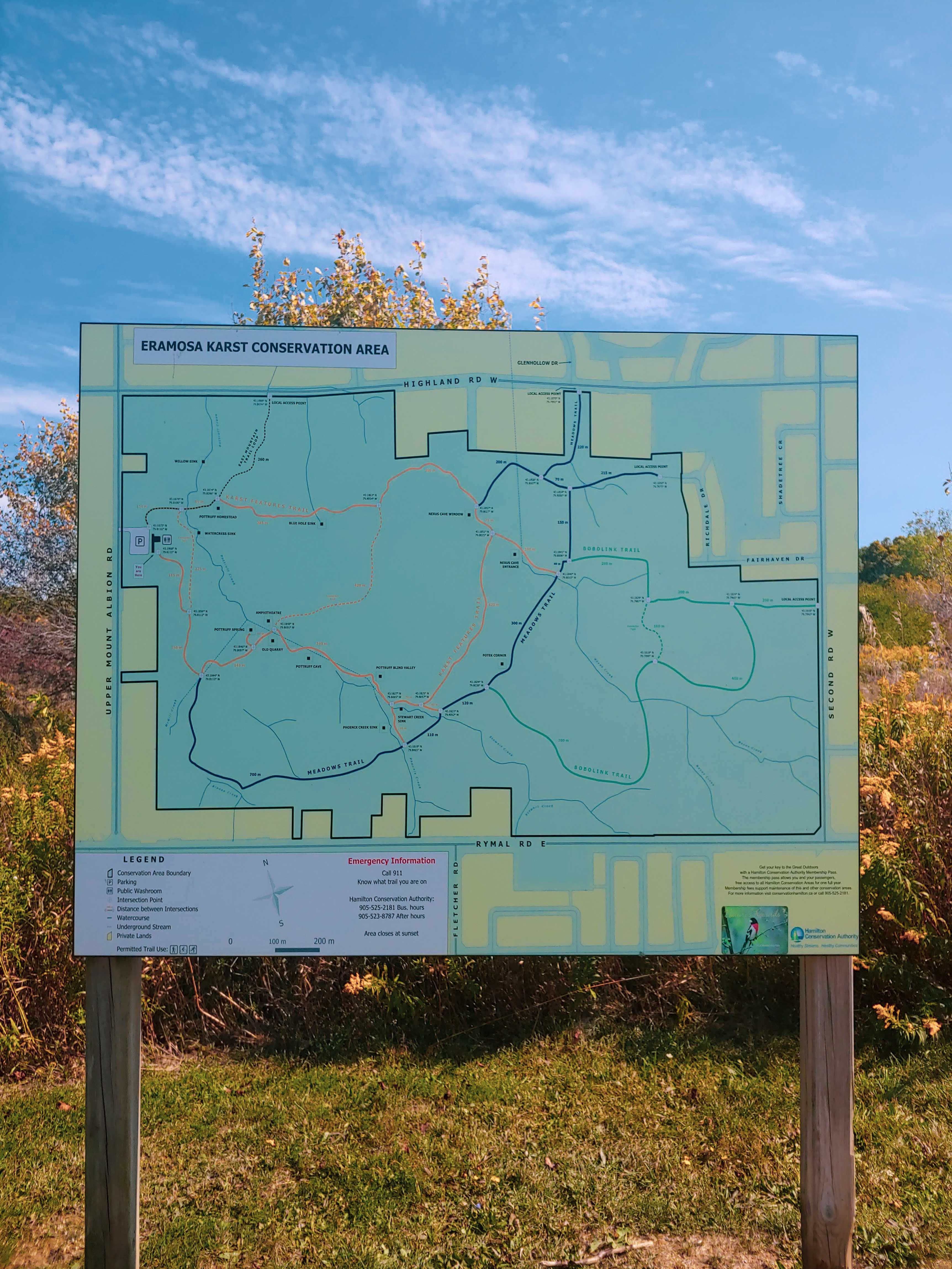 Eramosa Karst is located in a fairly residential area, which probably wasn’t always the case, but it is a fairly significant area of environmental interest and preservation within the Hamilton Conservation Authority. In 2003, the Ontario Ministry of Natural Resources designated the Eramosa Karst lands as an Area of Natural and Scientific Interest. The website for the Hamilton Conservation Authority notes that Eramosa Karst is believed to have the largest number of unique karst features in any single area in the province. Pretty exciting to have this little gem right in our backyard!